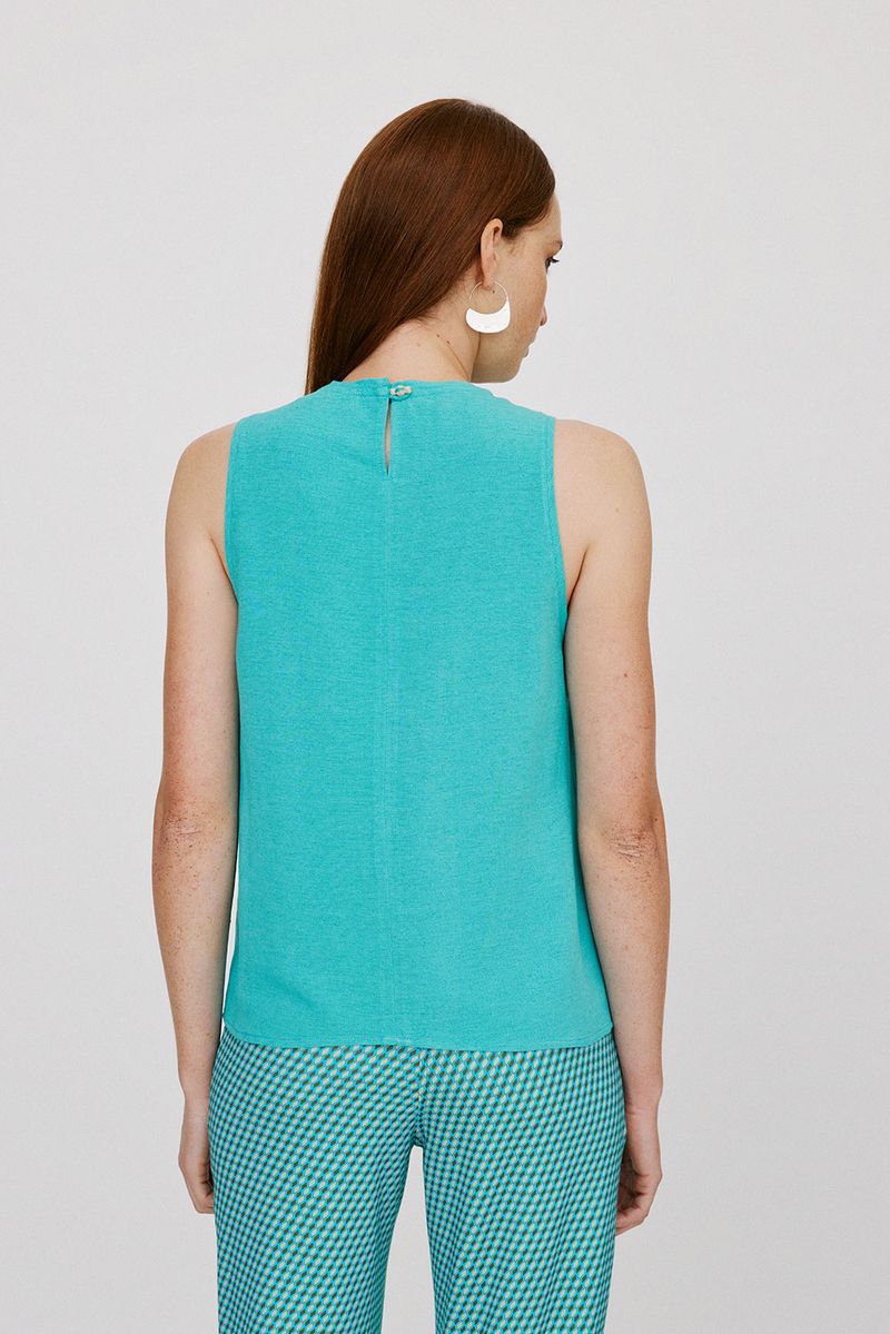 Blusa de tecido plano em viscose com linho, sem manga, com decote redondo, pence na altura do busto, detalhe de gota e botão posterior. modelo veste tamanho 38.