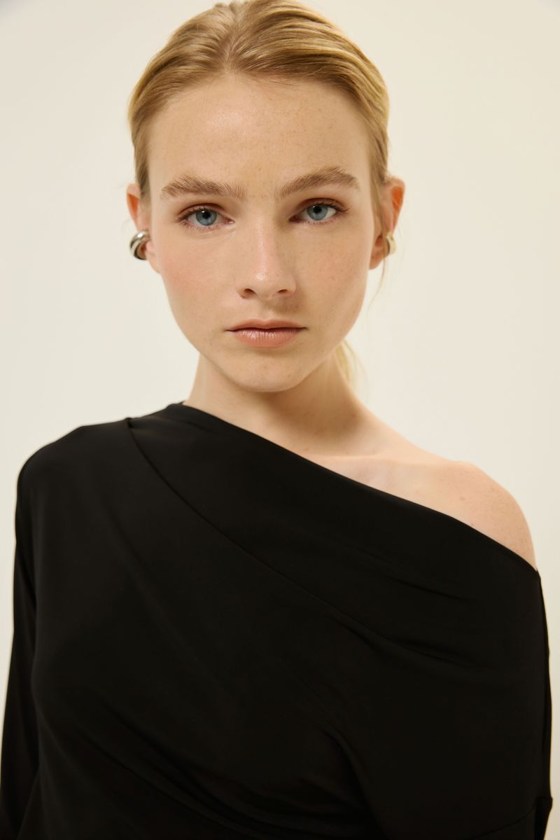 Blusa em malha jersey premium leve, modelagem ajustada ao corpo com detalhe lateral, decote ombro só e manga longa. modelo veste tamanho p.
