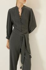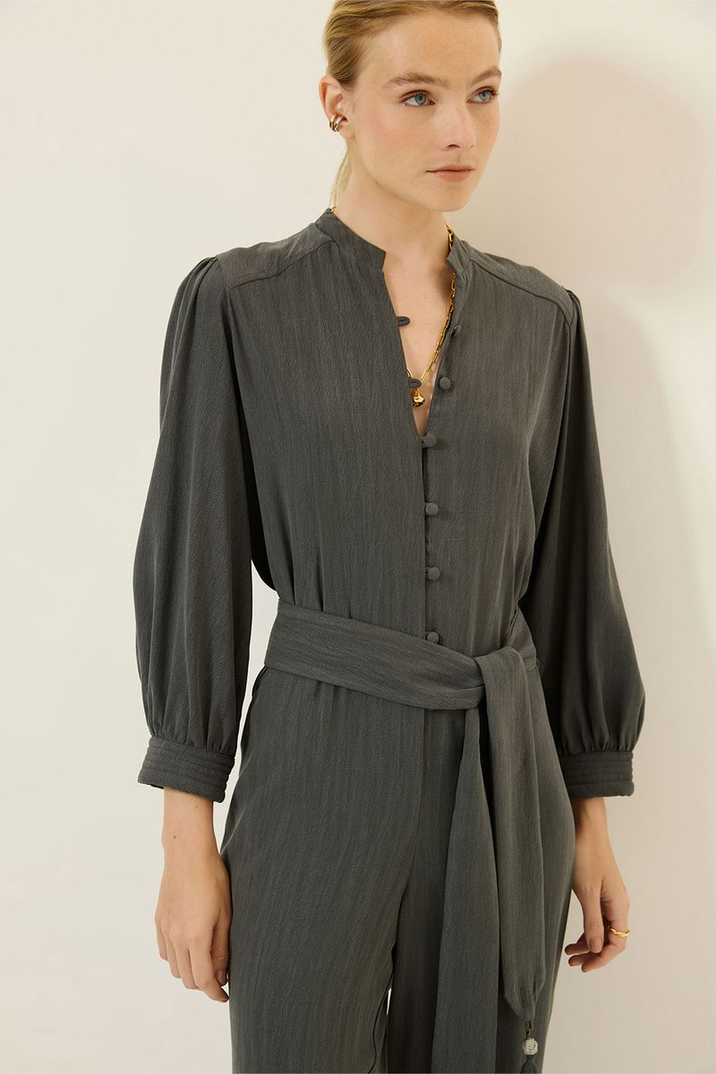 Macacão de tecido plano em liocel com viscose, manga longa levemente ampla com punho pespontado, barra com prega, recortes, decote v e fechamento frontal por botão forrado. peça possui faixa do próprio tecido. modelo veste tamanho 38.