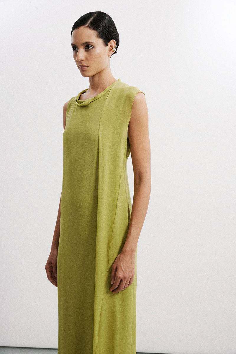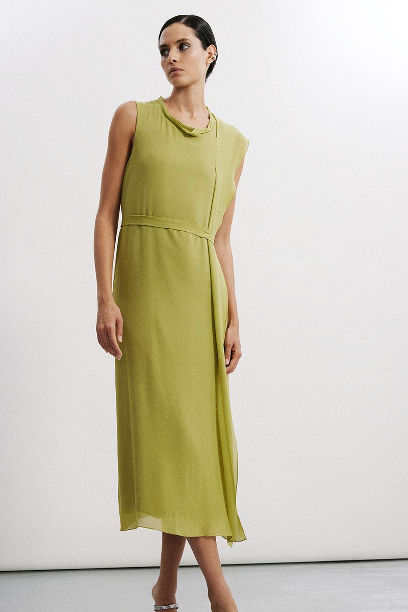 Vestido de tecido plano em ggt de viscose leve e fluído, sem manga, decote redondo com torção, detalhe dobra frontal, faixa opcional para amarração cintura e comprimento midi. modelo veste tamanho 38.