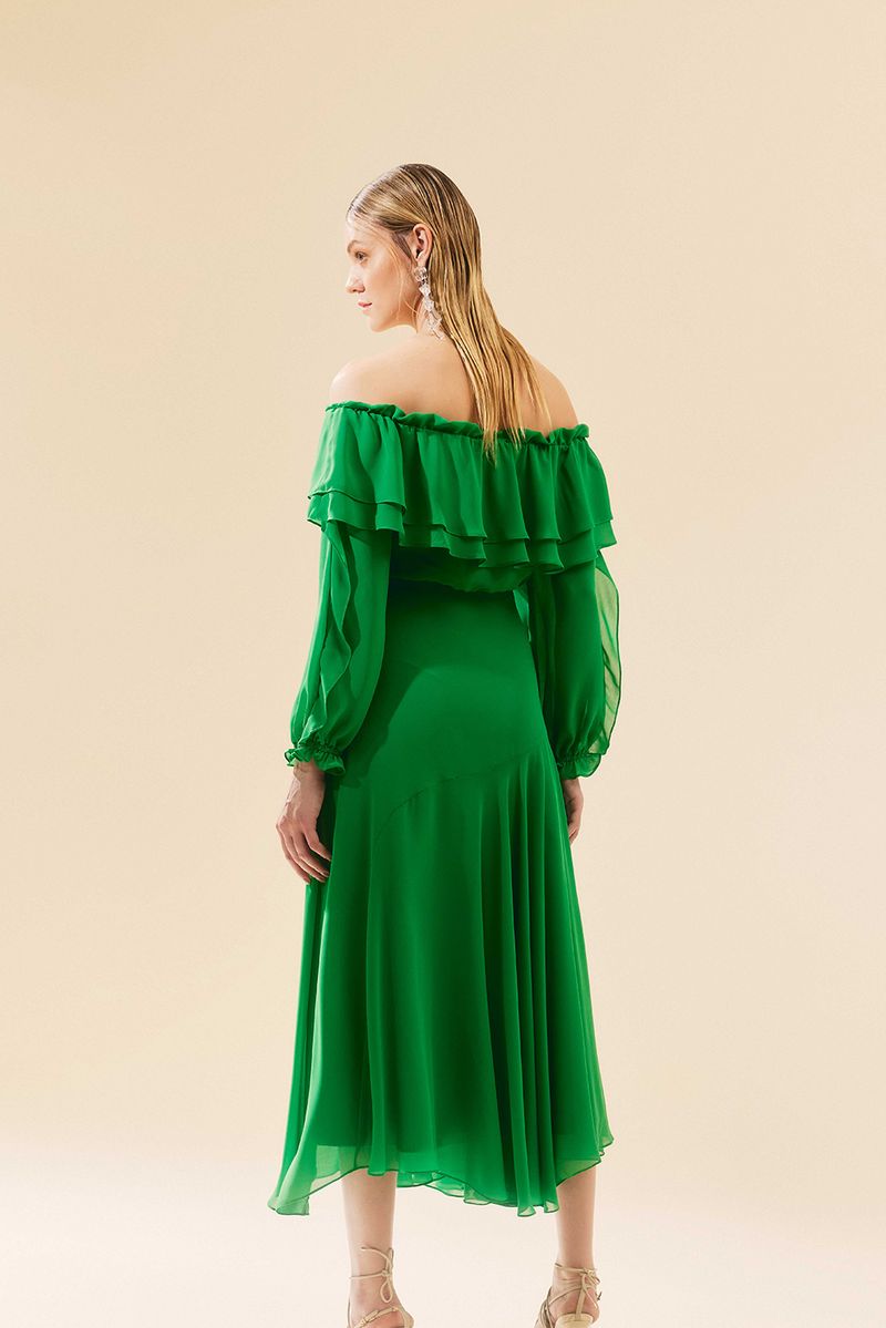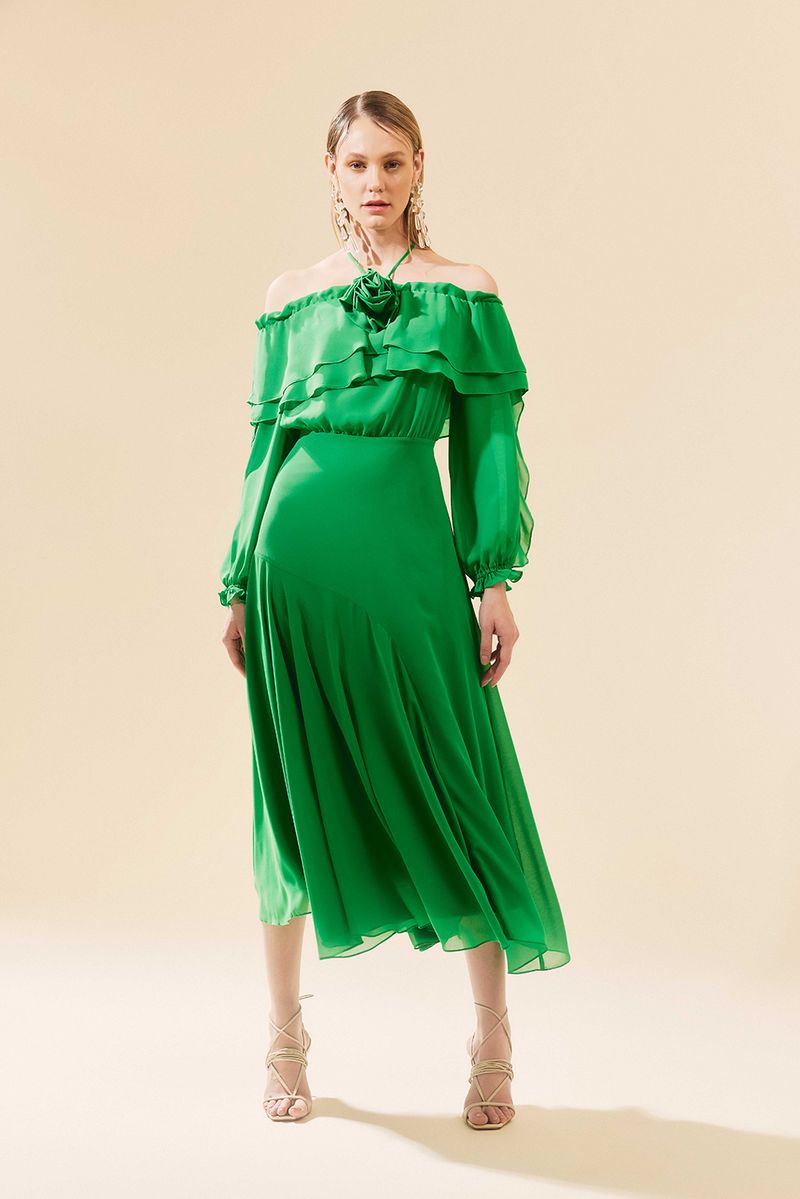 Vestido de tecido plano em crepe ggt leve, fluído, decote trapézio com detalhe de broche flor, manga longa com jabot e elástico no punho, recortes saia, comprimento cropped e fechamento por zíper lateral. peça forrada. modelo veste tamanho 38.