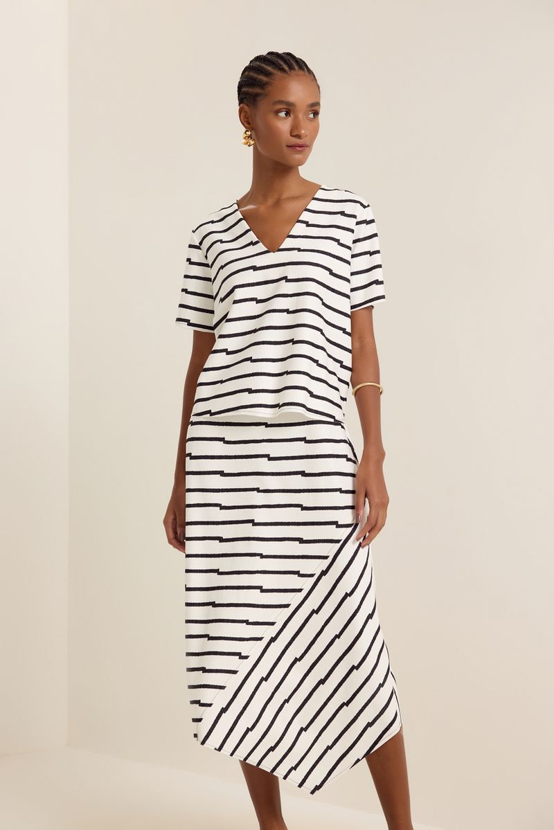 Blusa malha de viscose sustentável proveniente de fontes renováveis estampa listra pb, manga curta, decote v, modelagem reta e acabamento a fio. modelo veste tamanho p.