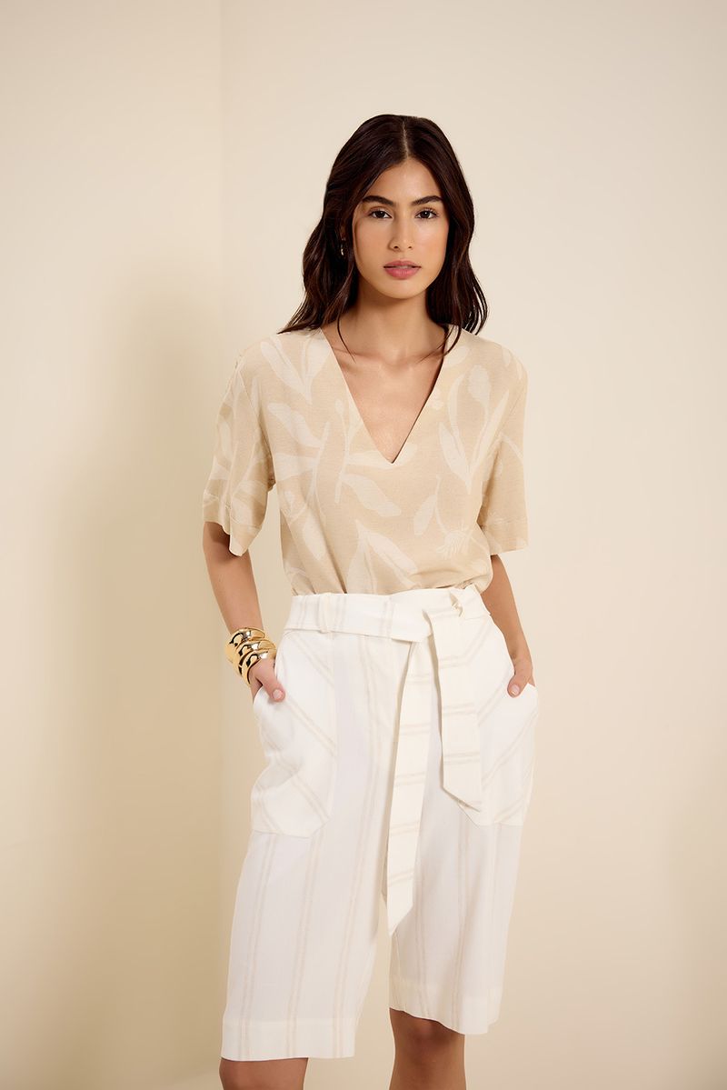 Bermuda de tecido plano em viscose com linho, jogo de listras, modelagem reta, bolso lateral e posterior e fechamento por zíper e colchete. peça possui faixa do próprio tecido. modelo veste tamanho 38.