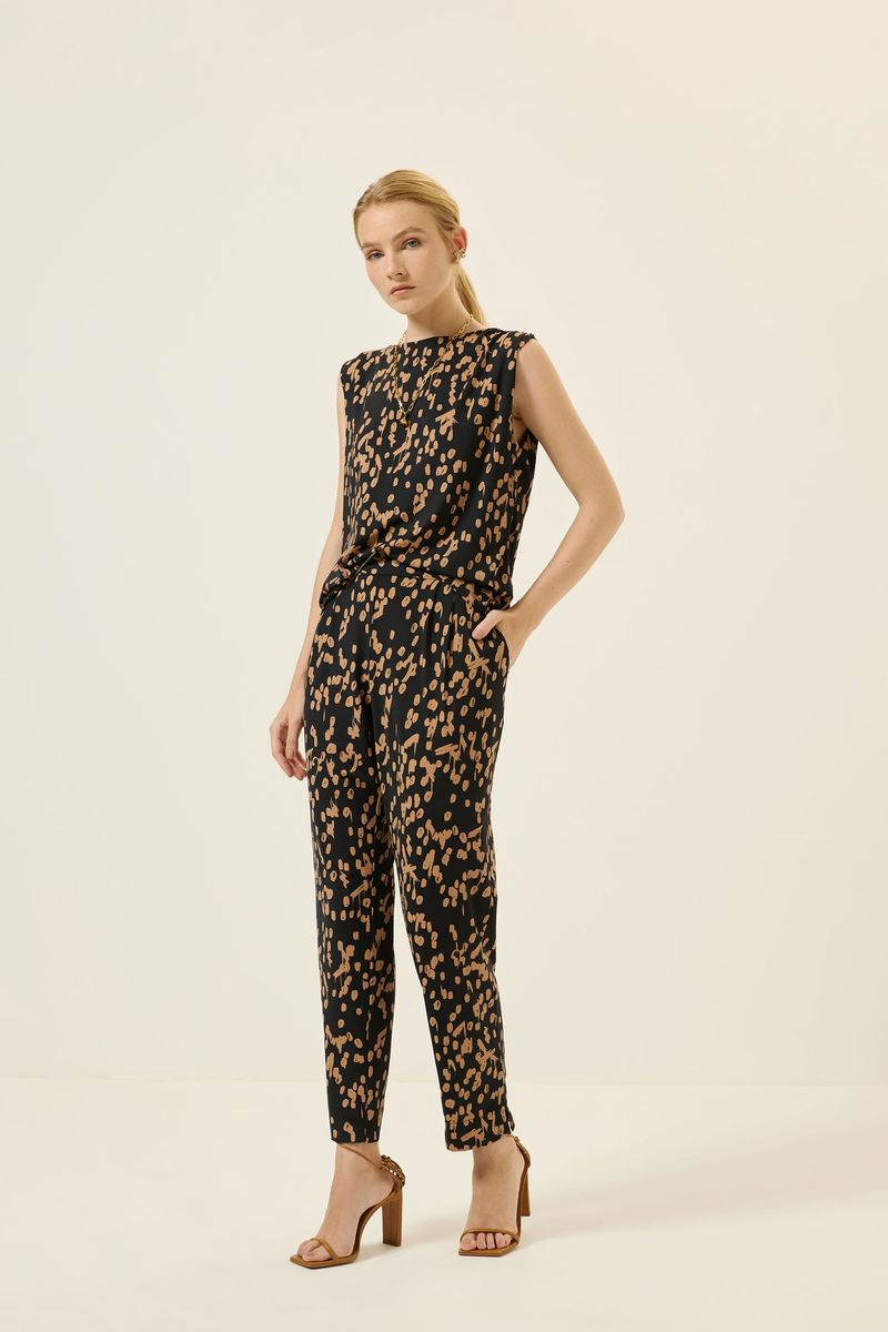 Blusa em malha jersey de poliamida biodegradável, sustentável e com proteção uv 50+ estampa melodia, modelagem reta, decote redondo, sem manga, detalhe drapeado ombro e porta busto. modelo veste tamanho p.