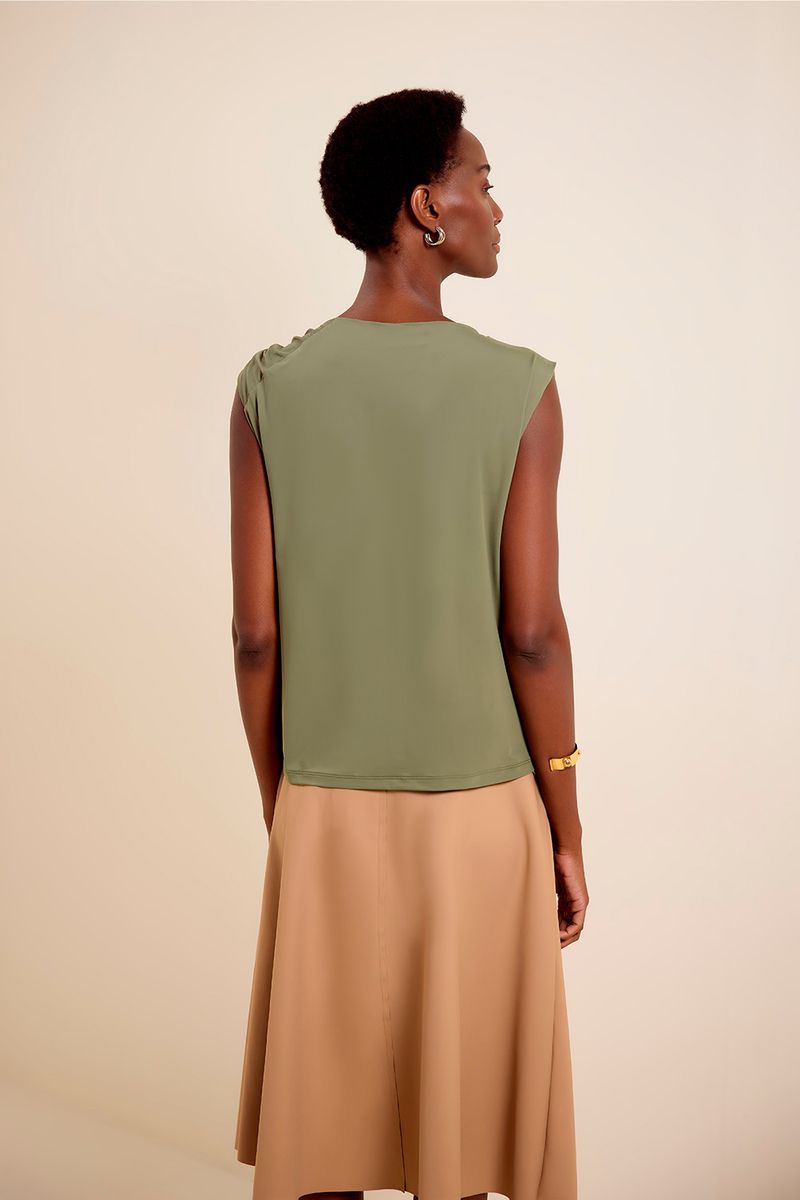 Blusa em malha jersey de poliamida biodegradável, sustentável e com proteção uv 50+, modelagem reta, decote redondo, sem manga e detalhe torção ombro lateral com aviamento especial. modelo veste tamanho p.