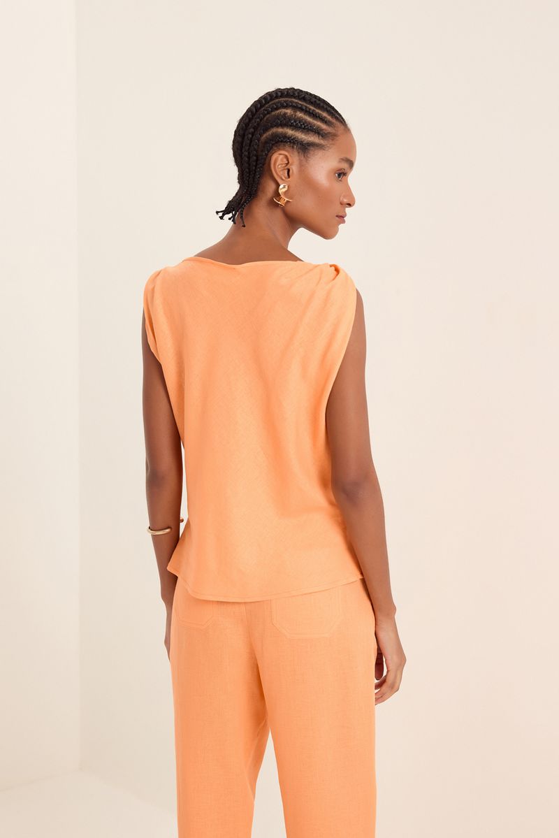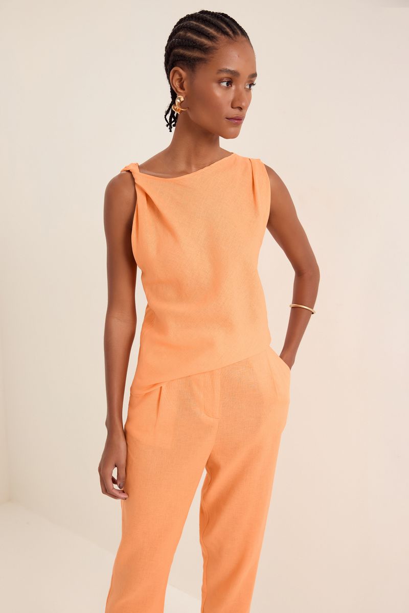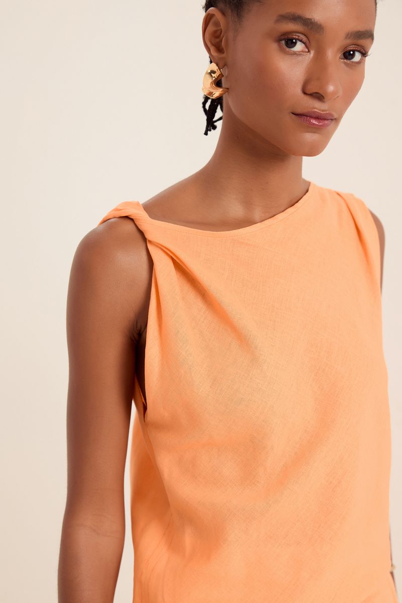 Blusa de tecido plano em cambraia de linho com viscose, modelagem reta, sem manga e decote canoa com detalhe unilateral de torção. modelo veste tamanho 38.