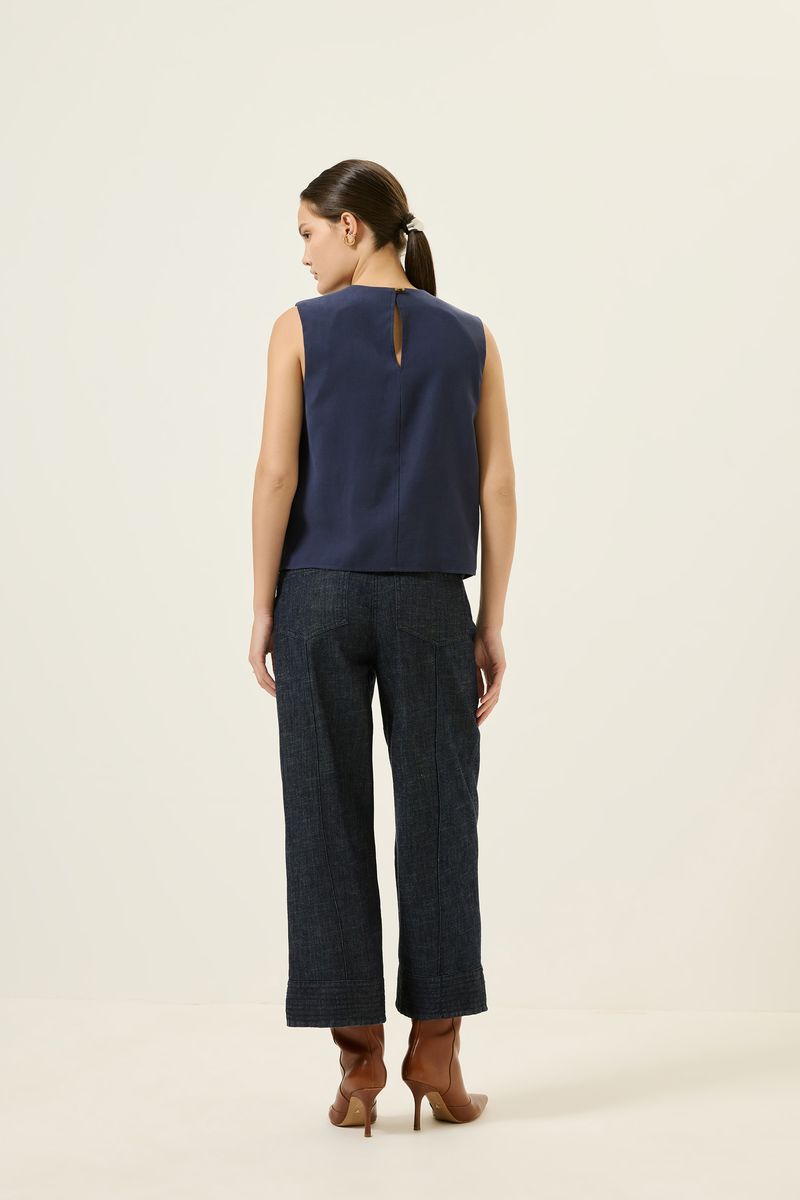 Blusa de tecido plano em viscose mista, modelagem solta ao corpo, sem manga, decote redondo e fechamento costas por botão. modelo veste tamanho 38.
