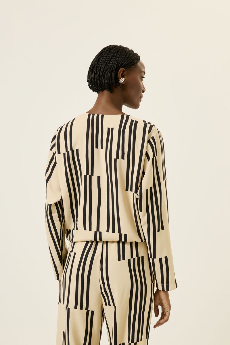Blusa de tecido plano em viscose estampa partituras, decote redondo, manga longa, modelagem levemente ampla com ajuste barra por faixa amarração. modelo veste tamanho 38.