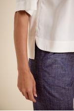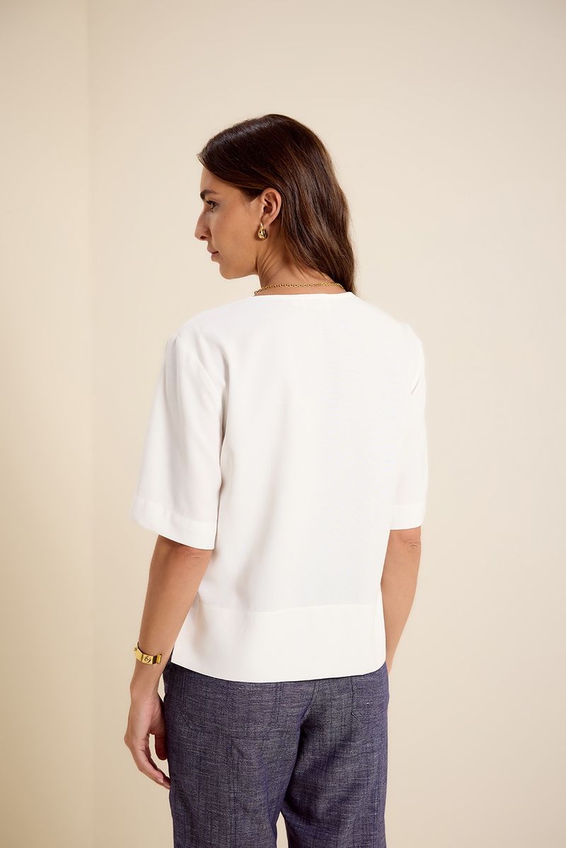 Blusa de tecido plano em viscose, modelagem reta, decote v, manga curta, detalhe barra lateral assimétrica. modelo veste tamanho 38.