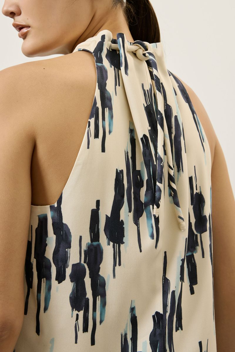 Blusa de tecido plano em viscose twill alafaiataria estampa gipsy, modelagem reta, decote trapézio franzido com rolotê amarração e sem manga. peça forrada. modelo veste tamanho 38.