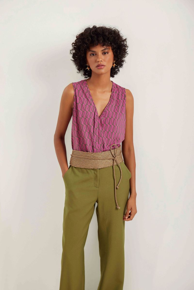 Blusa em malha jersey de poliamida biodegradável, sustentável e com proteção uv 50 + estampa palmeira, modelagem reta, decote v com detalhe dobra e sem manga. modelo veste tamanho p.