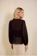 Blusa de tecido plano em rami, modelagem levemente ampla, decote em gota com detalhe pregas e manga longa com elástico no punho. possui combinação. modelo veste tamanho 38.