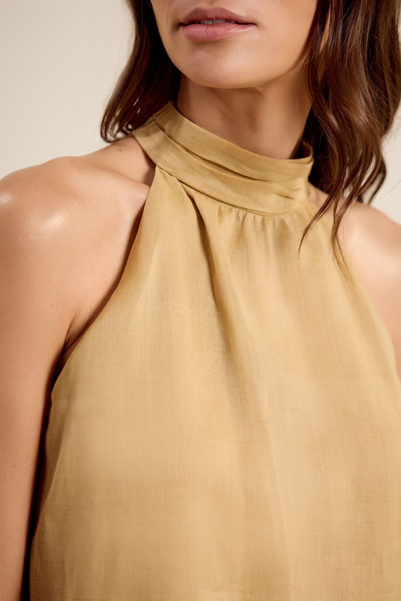 Blusa de tecido plano em rami, modelagem reta, decote gola franzida com fechamento em botão posterior e sem manga. peça forrada. modelo veste tamanho 38.