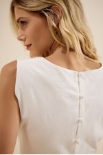 Blusa de tecido plano em algodão com linho, jacquard, modelagem solta ao corpo com pence, decote v, sem manga e abotoamento costas. peça possui forro. modelo veste tamanho 38.