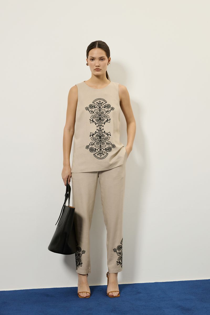 Blusa de tecido plano em viscose com linho, modelagem reta sem manga, comprimento mais alongado, decote redondo, fenda lateral e bordado de elemento da estampa maria bonita. modelo veste tamanho 38.