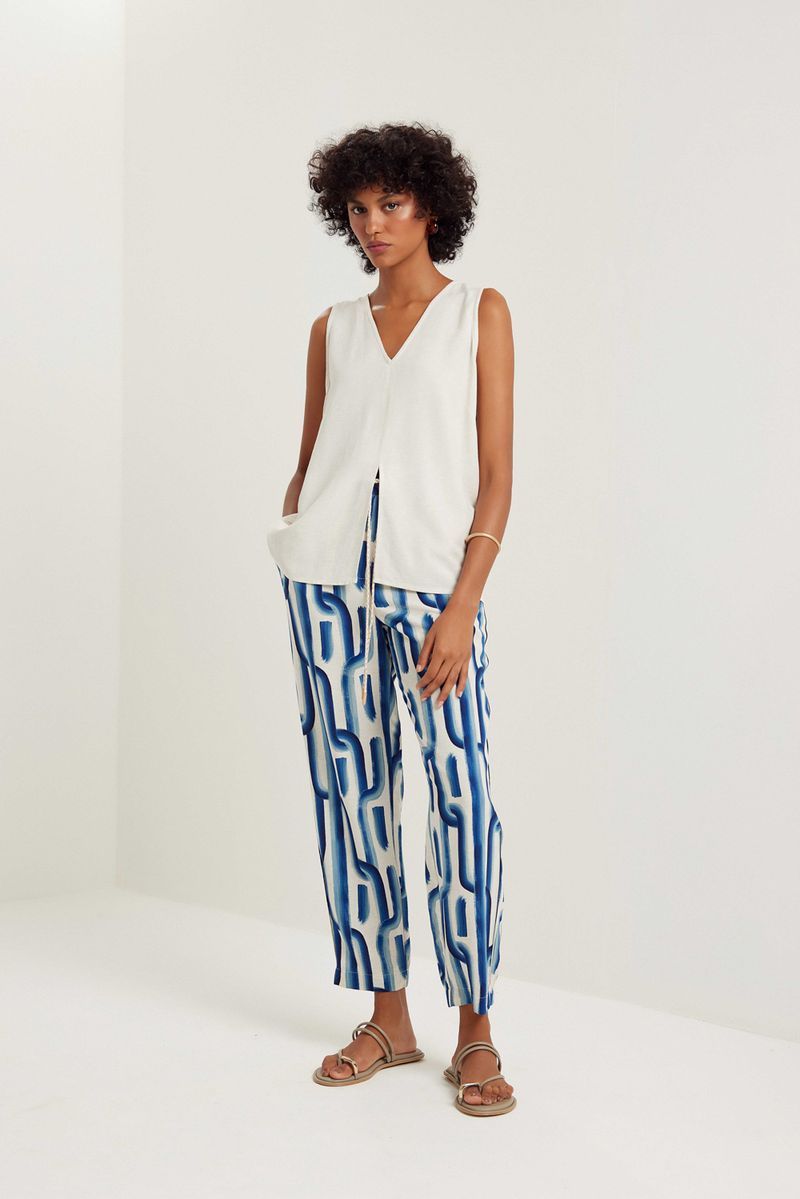 Blusa de tecido plano em viscose com linho pesado, sem manga, decote v, pence no busto e fenda frontal. modelo veste tamanho 38.