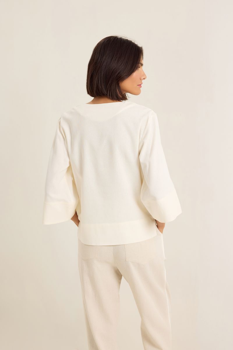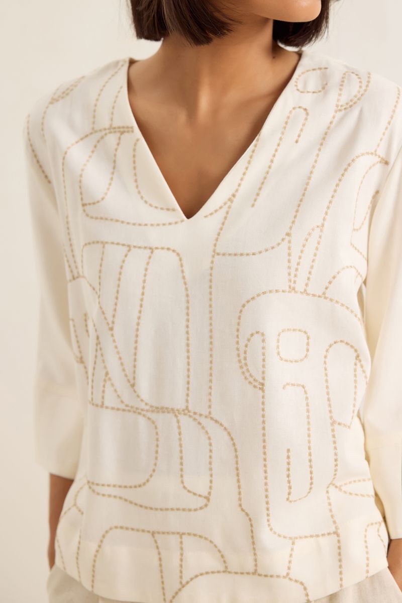 Blusa de tecido plano em viscose com linho, modelagem solta ao corpo, manga 7/8 com punho largo, leve fenda lateral e decote v. peça possui bordado pontilhado inspirado na estampa "barzinho" da coleção. modelo veste tamanho 38.