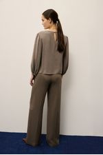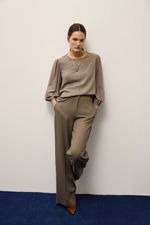Blusa de tecido plano em viscose, com detalhe de lurex, modelagem solta ao corpo, manga 7/8 com franzido no punho e fechamento costas por botão forrado. modelo veste tamanho 38.