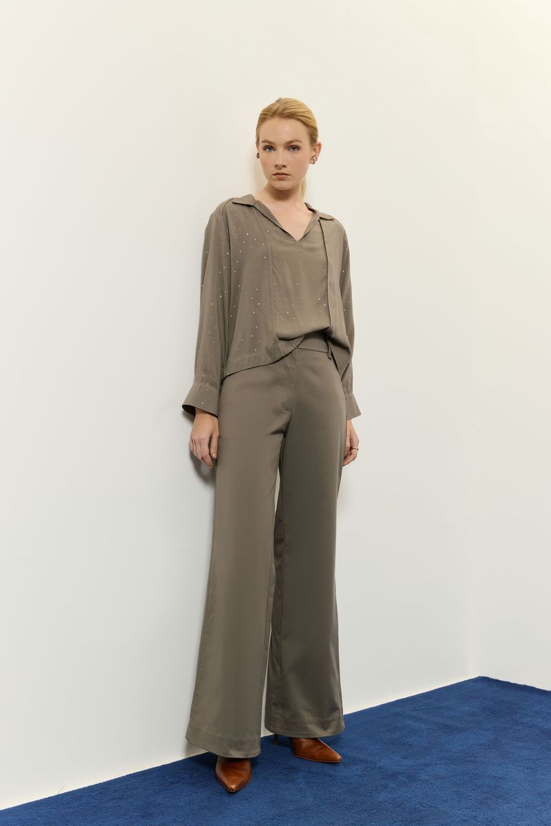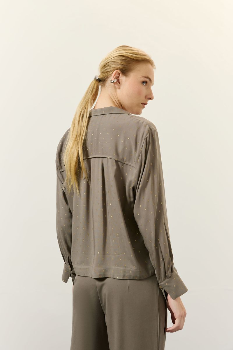 Blusa de tecido plano em viscose, com detalhe de lurex, modelagem solta ao corpo, manga longa com abotoamento no punho, decote v com gola e detalhe de vivo frente e costas. modelo veste tamanho 38.