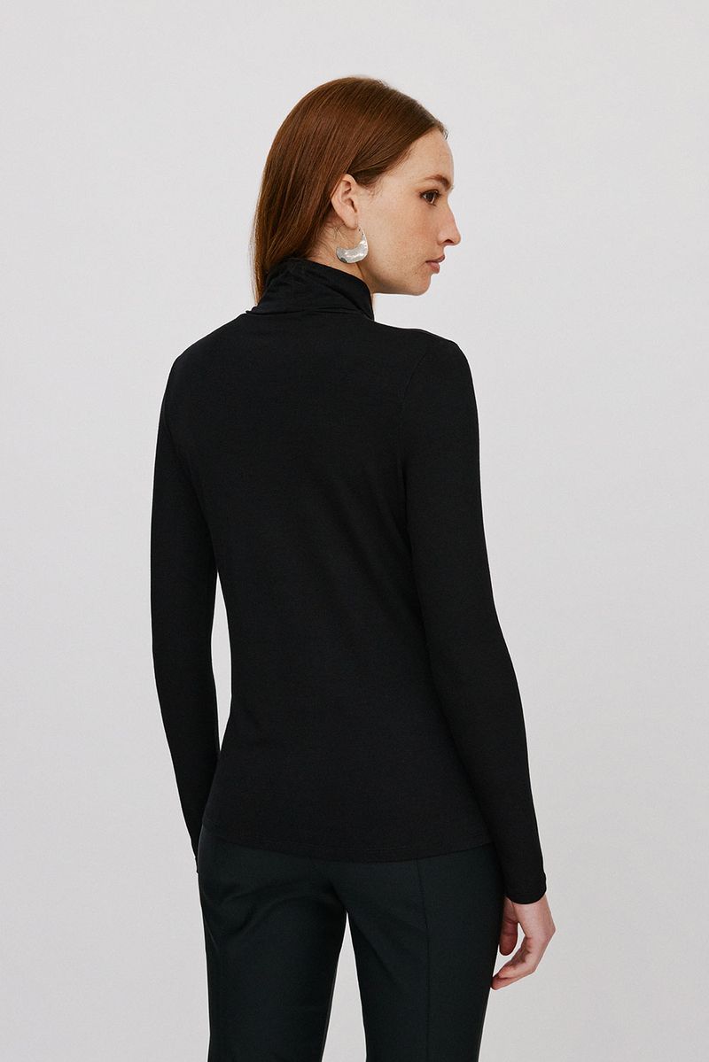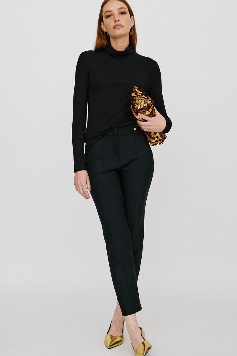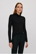 Blusa em malha de viscose sustentável provenientes de fontes renovavéis, gola alta, manga longa e shape justo. modelo veste tamanho p.