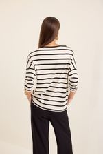 Blusa em malha linho listrado fio tinto, modelo reto, decote redondo com viés, manga longa com detalhe franzido punho. modelo veste tamanho p.
