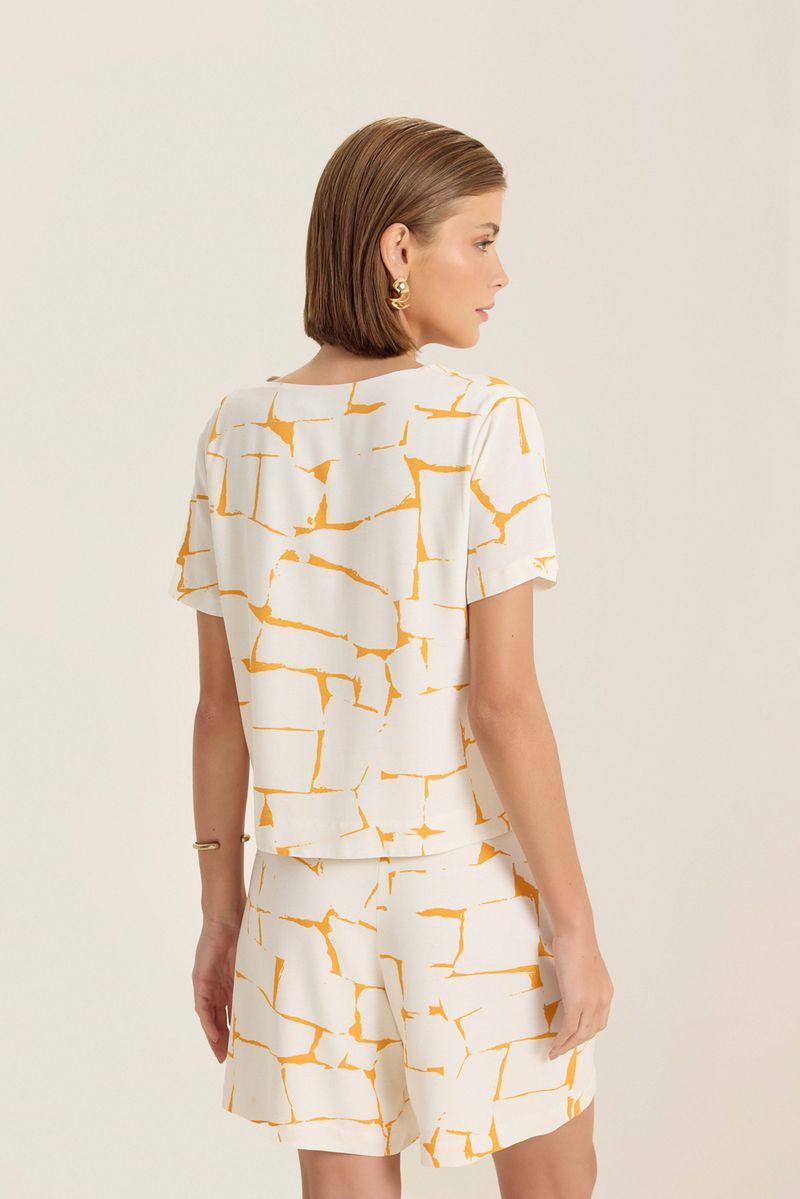 Blusa de tecido plano viscose alfaiataria maquinetada com linho estampa azulejo, modelagem reta, decote v, manga curta, leve fenda lateral e peça forrada . modelo veste tamanho 38.