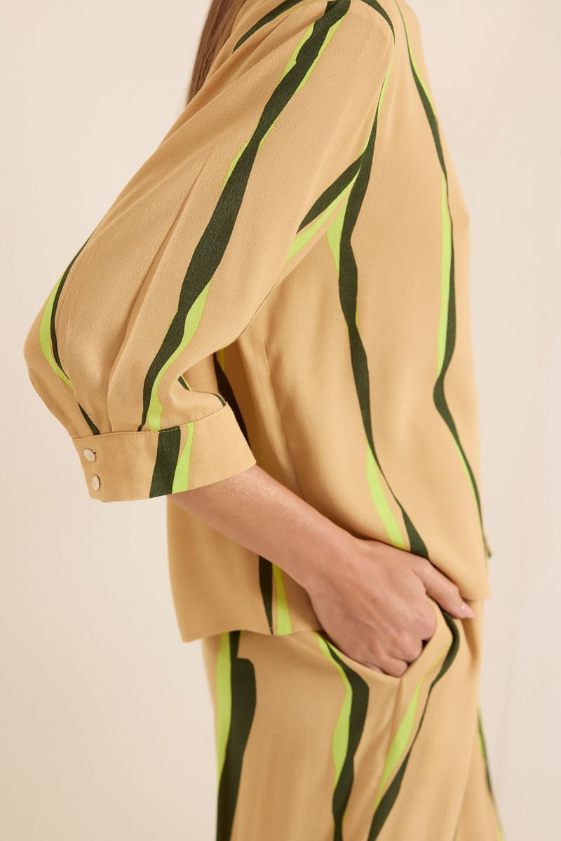 Blusa de tecido plano em crepe de viscose estampa areias, modelagem reta, manga 7/8 com abertura e botão, decote redondo, leve fenda nas laterais, fechamento em gota com botão posterior. modelo veste tamanho 38.