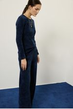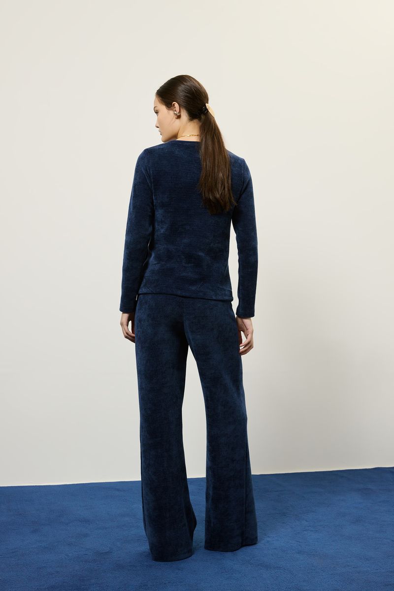Blusa em malha veludo chenille canelado, modelagem ajustada ao corpo, decote redondo com detalhe retilínea e manga longa. modelo veste tamanho p.