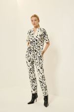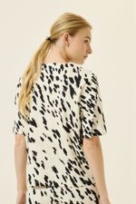Blusa malha de viscose sustentável proveniente de fontes renováveis estampa montaria, modelagem reta, decote v e manga curta. modelo veste tamanho p.