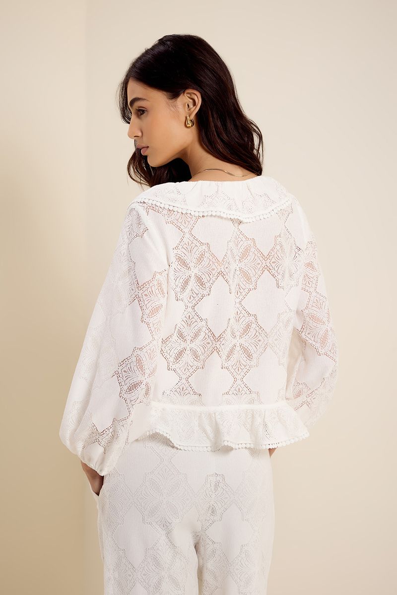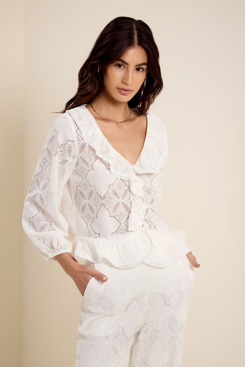 Blusa de tecido plano em algodão com viscose, rendado, com manga 7/8 e elástico no punho, decote v com babado, detalhe de rendinha e fechamento frontal por botão. modelo veste tamanho 38.