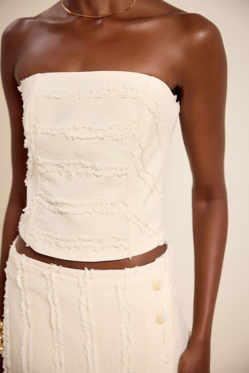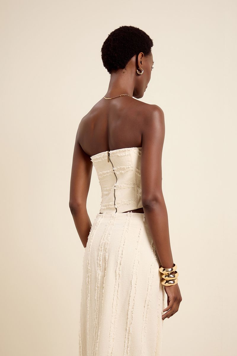 Blusa de tecido plano em algodão com detalhe em franja, modelagem ajustada ao corpo tipo corset, sem alça e fechamento posterior por zíper de metal. peça possui forro. modelo veste tamanho 38.