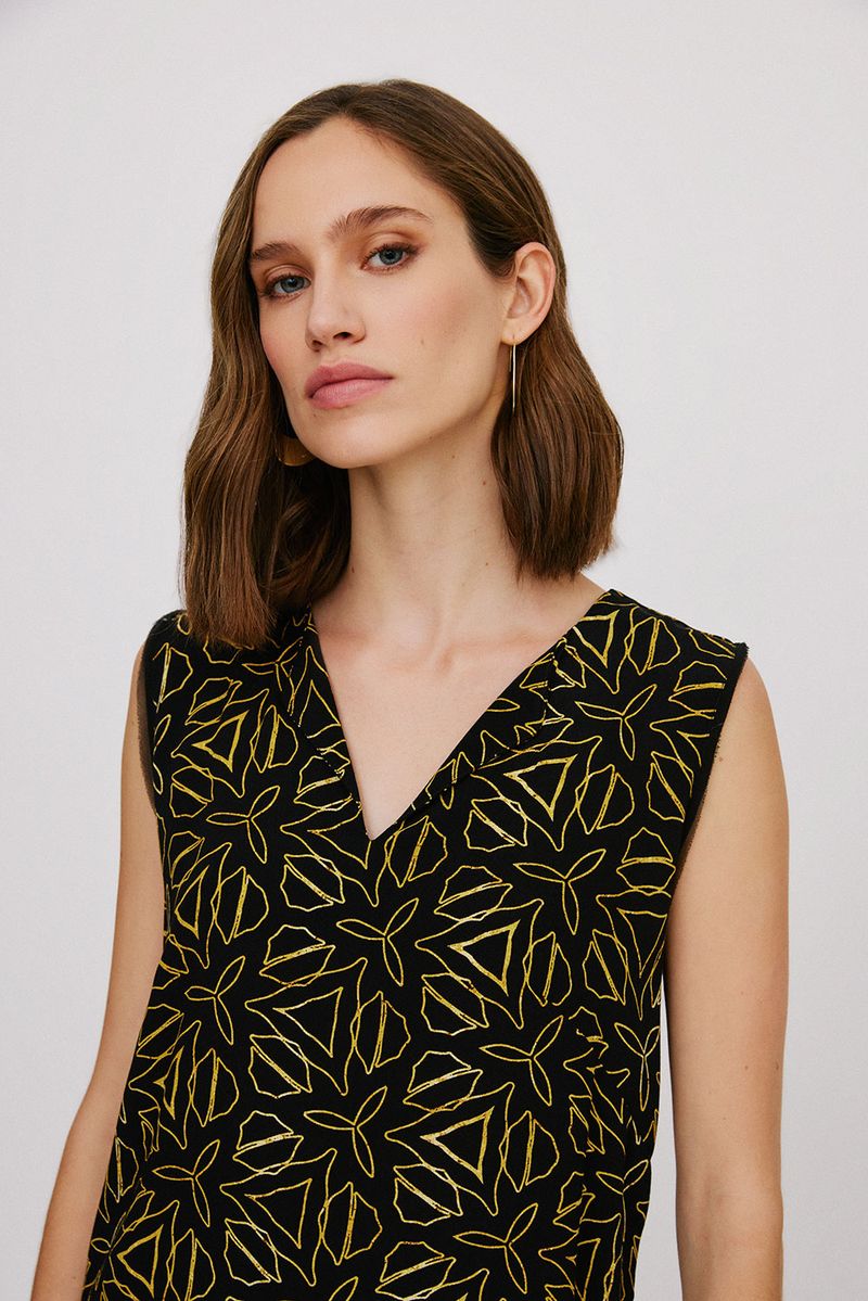 Blusa de tecido plano em crepe de viscose estampa floral linha, decote v, sem manga ombro largo, pala costas com leve franzido, modelagem reta. modelo veste tamanho 38.