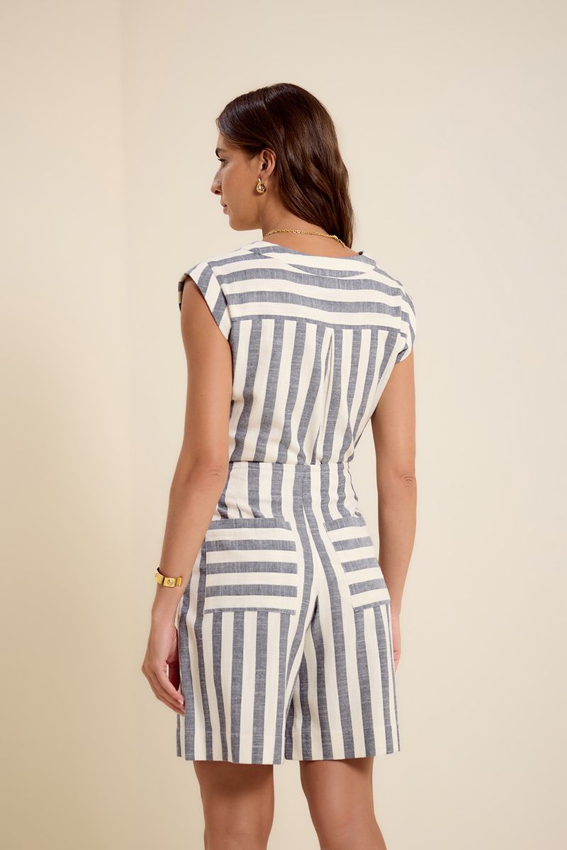 Blusa de tecido plano em algodão com padrão de listras, modelagem reta, sem manga, decote v e prega costas. modelo veste tamanho 38.