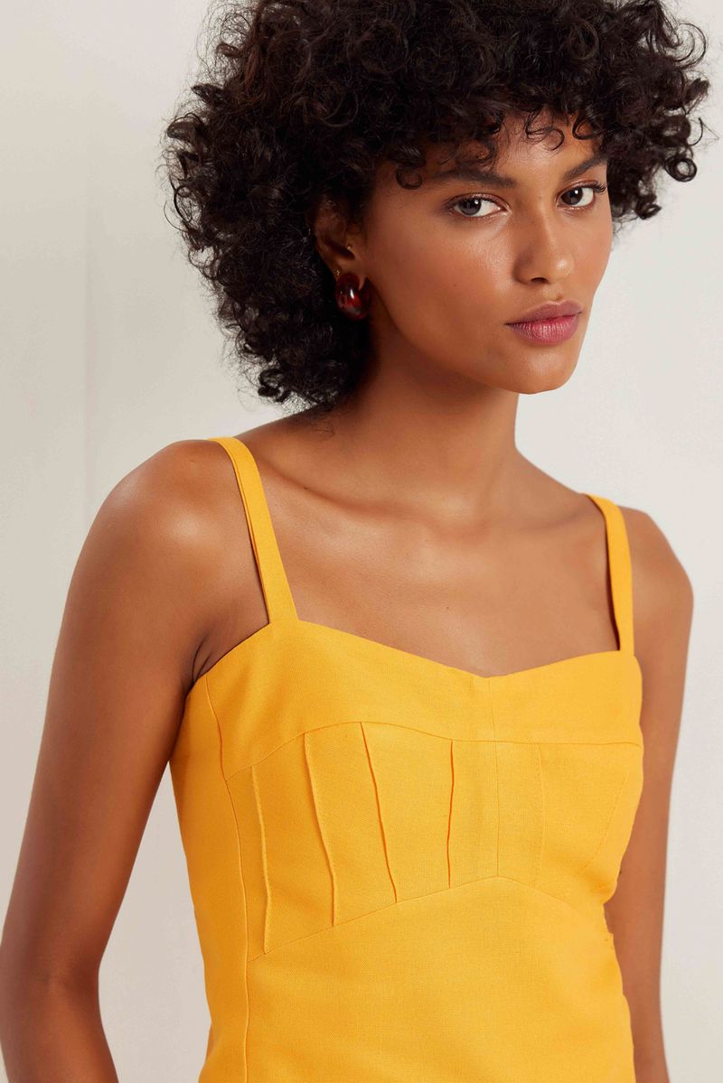 Top de tecido plano em viscose, comprimento cropped, sem manga, detalhe frontal nervuras e fechamento costas por zíper invisível. peça possui forro. modelo veste tamanho 38.