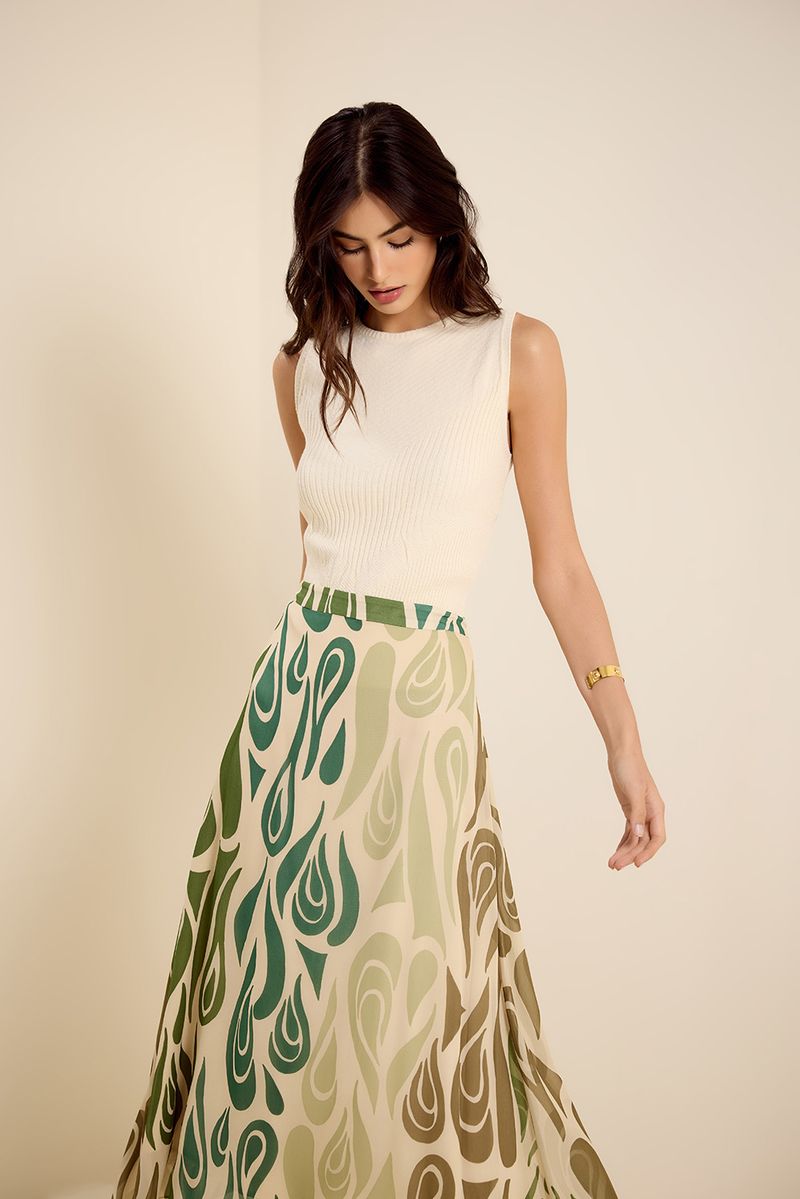 Blusa de tricot em fio fresh com mix canelado, sem manga, modelagem ajustada ao corpo e com decote redondo. modelo veste tamanho p.