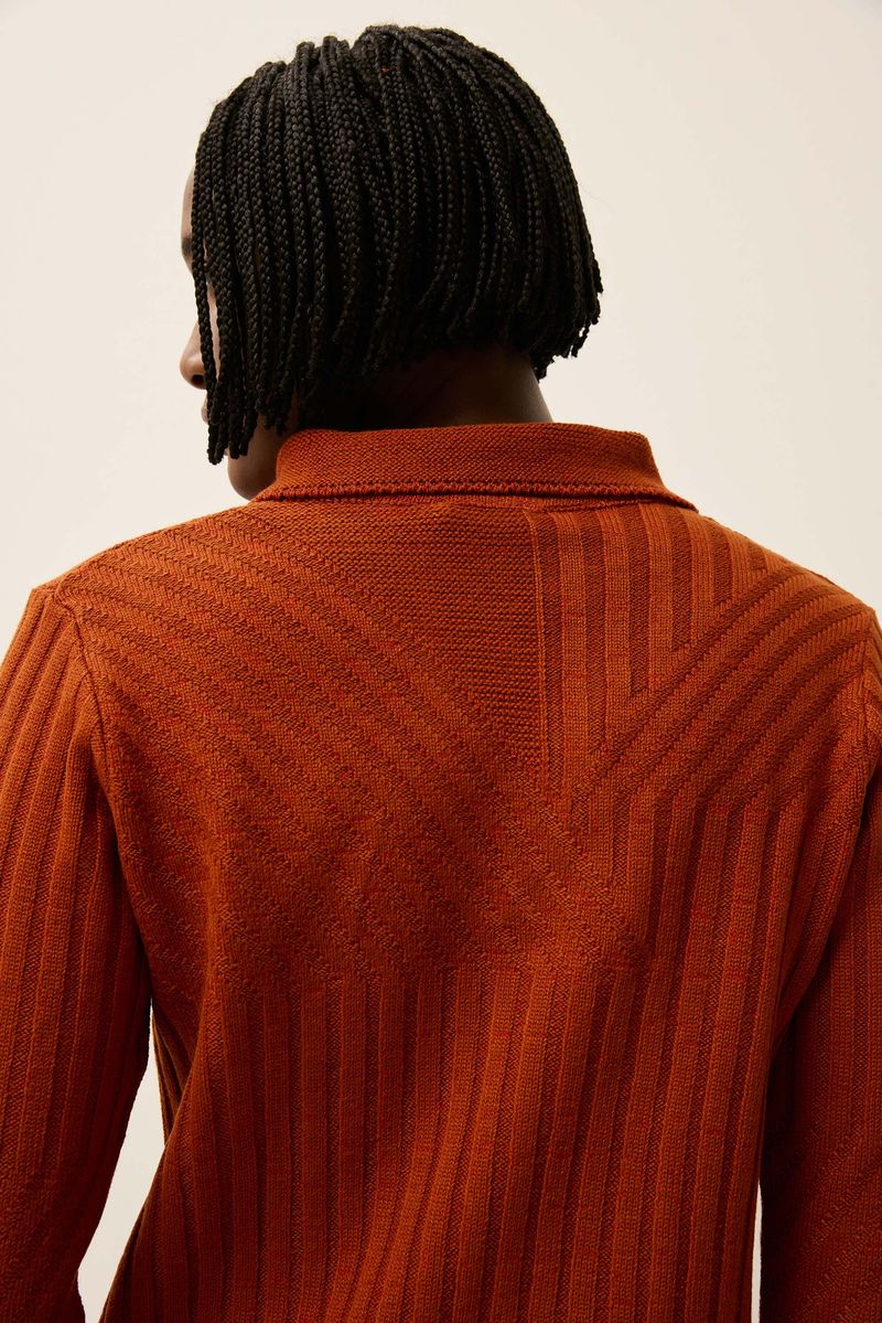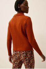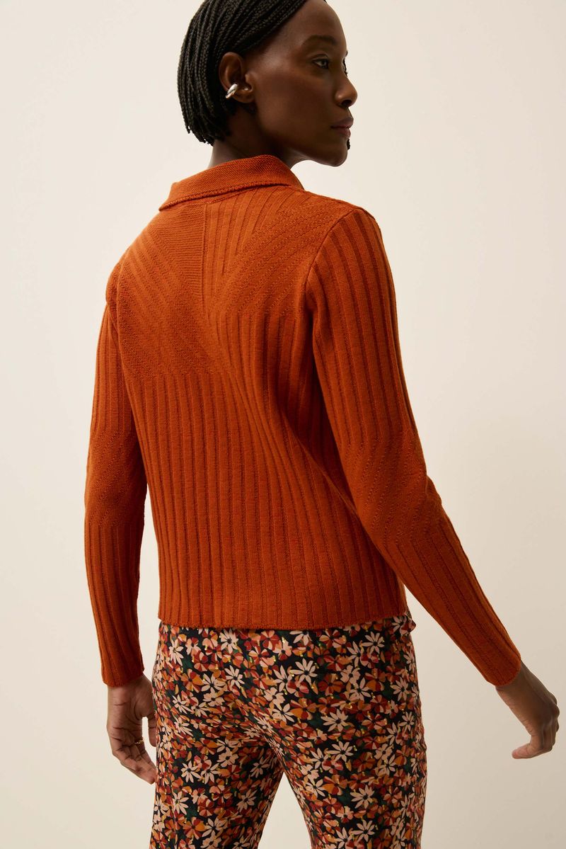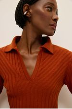 Blusa de tricot em acrilico com elastano, modelagem reta, mix de pontos, manga longa, decote v e gola polo. modelo veste tamanho p.