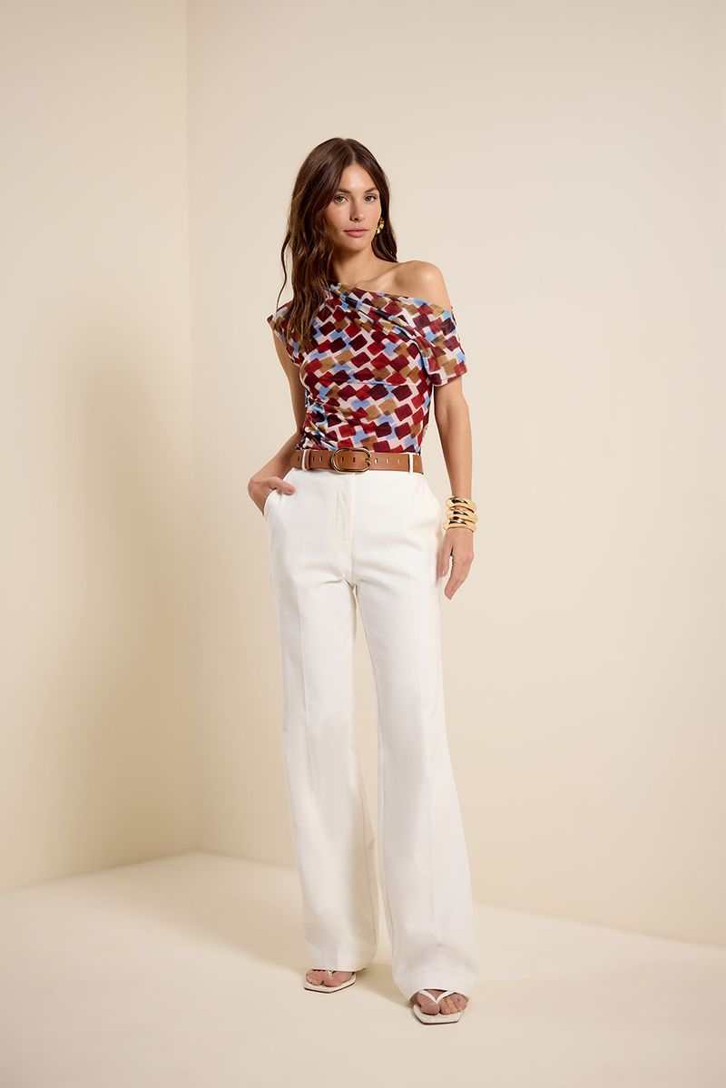 Blusa tule ombro pregas quadros marrom urucum