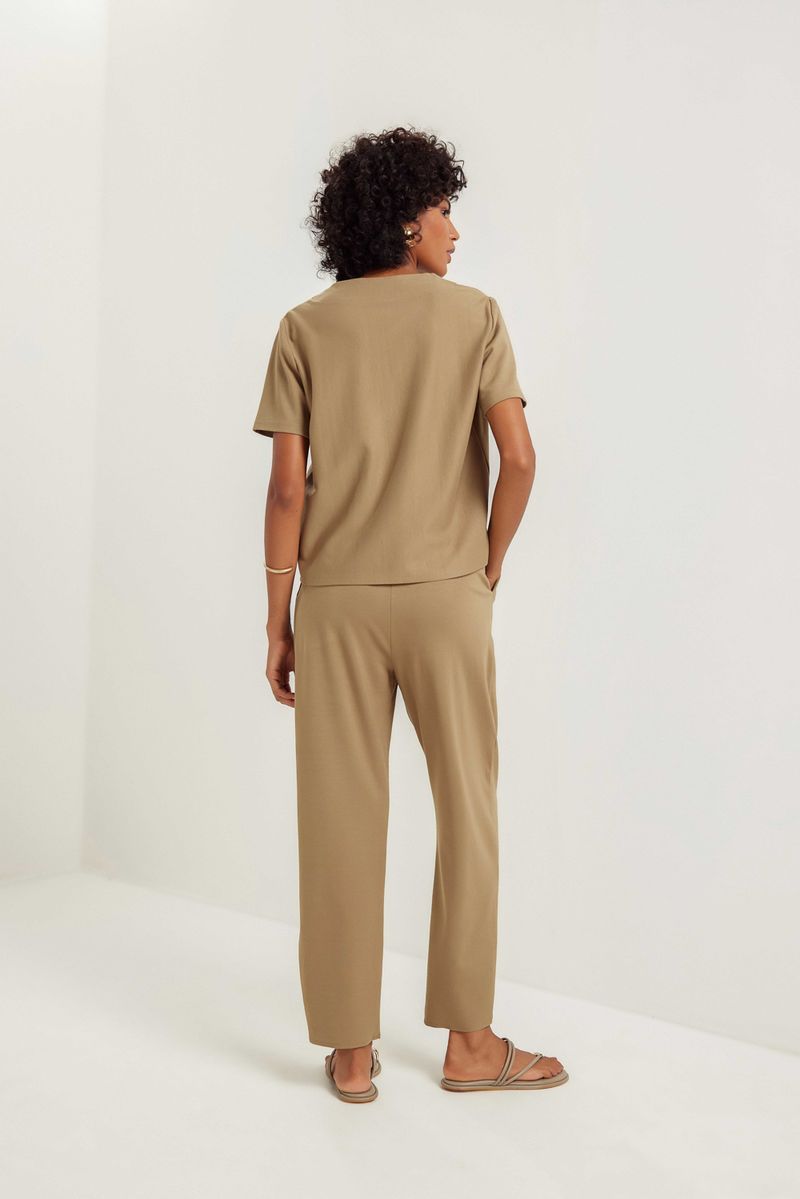 Calça malha de viscose sustentável proveniente de fontes renováveis, bolso faca, cós com detalhe dobradura, acabamento a fio e fechamento em zíper lateral. modelo veste tamanho p.