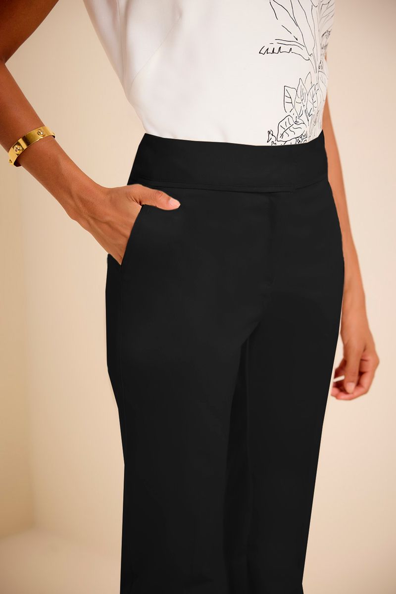 Calça de tecido plano em alfaiataria com elastano, modelagem reta, bolso lateral, detalhe de vivo e fechamento frontal por colchete e zíper. modelo veste tamanho 38.