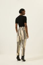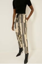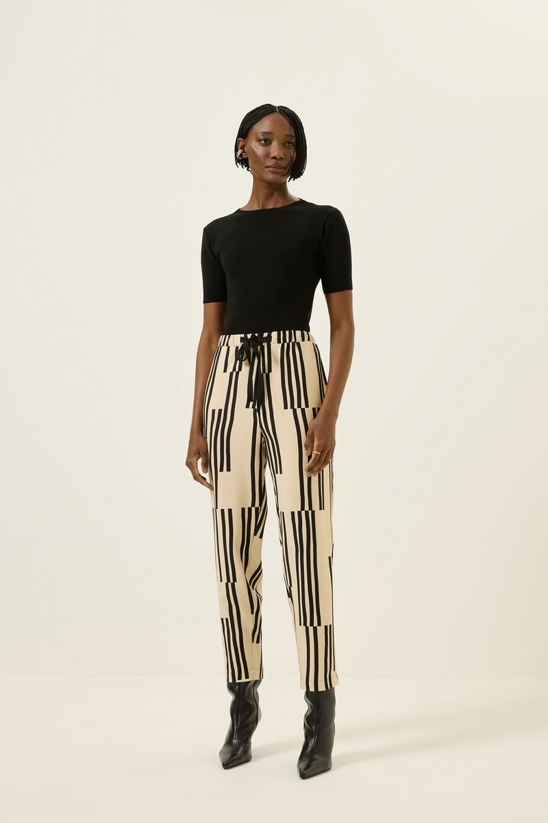 Calça de tecido plano em viscose estampa partituras, modelagem reta, cós com fechamento em botão e faixa para amarração frontal. modelo veste tamanho 38.