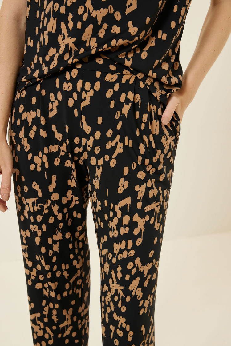 Calça em malha jersey de poliamida biodegradável, sustentável e com proteção uv 50+ estampa melodia, modelagem reta, cós elástico, bolso faca e leve fenda lateral barra. modelo veste tamanho p.