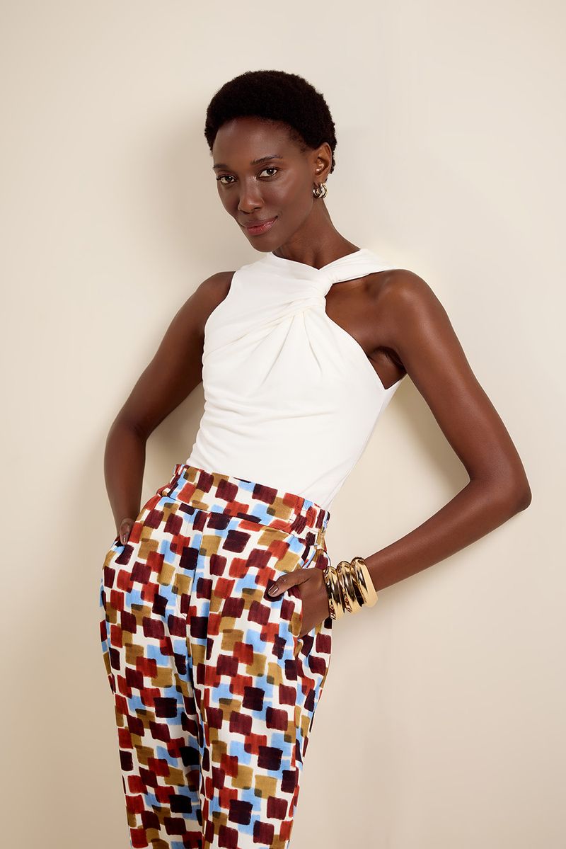 Calça de tecido plano acetinado em viscose estampa quadros, modelagem cenoura, bolso lateral, cós reto com detalhe falsa braguilha e elástico posterior. modelo veste tamanho 38.