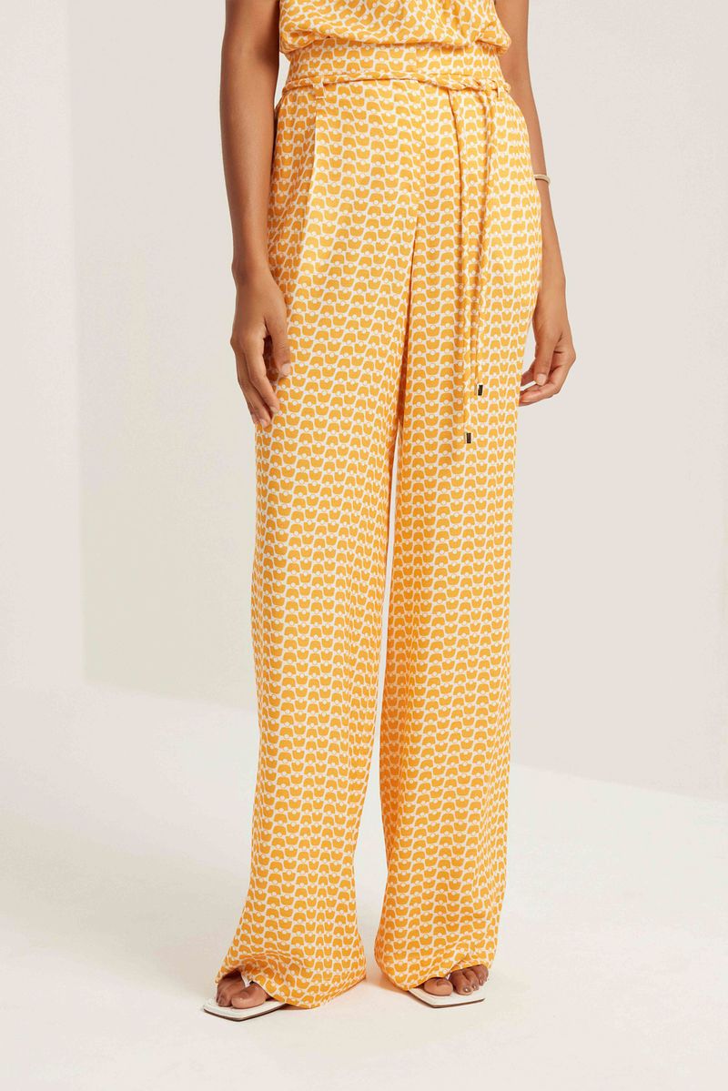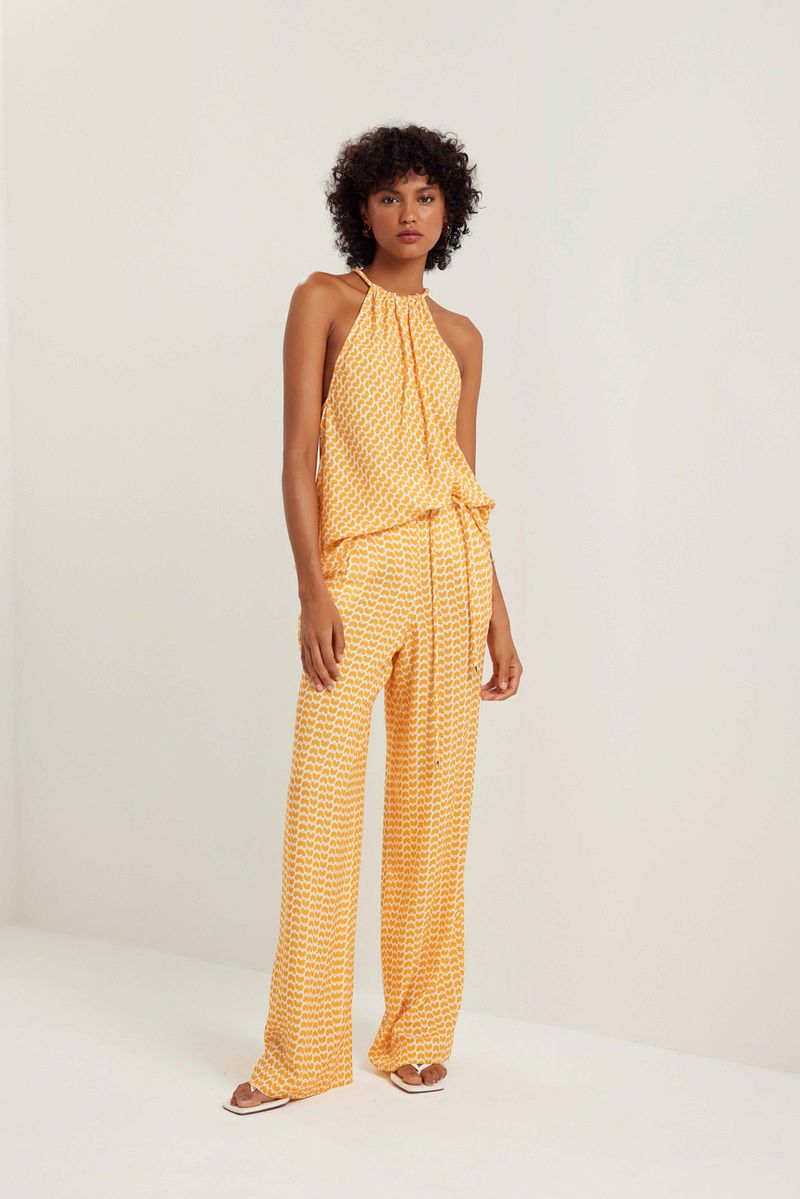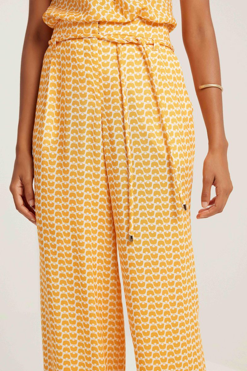 Calça de tecido plano em linho com viscose estampa praiana, modelo pantalona, bolso faca, cinto solto para amarração e fechamento em zíper e colchetes. modelo veste tamanho 38.