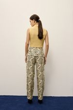 Calça de tecido plano em viscose twill estampa maria bonita, modelagem reta, detalhe pala assimétrica e fechamento em zíper lateral. modelo veste tamanho 38.