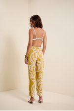 Calça de tecido plano em ggt de viscose leve e fluído estampa maranta, modelagem reta e cós posterior com elástico forrado. peça forrada. modelo veste tamanho 38.