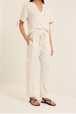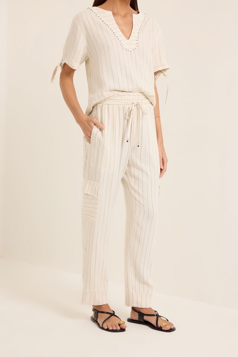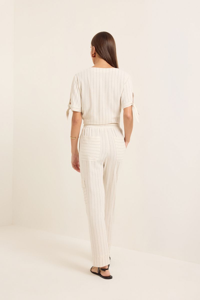 Calça de tecido plano em viscose com linho natural, modelagem reta, bolso estilo vargo e bolso faca e elástico no cós com amarração. modelo veste tamanho 38.