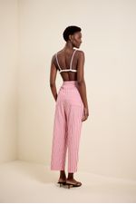 Calça de tecido plano em algodão com padrão de listras, modelagem reta, bolso lateral e posterior, amarração por rolotê frontal, cós posterior com elástico e fechamento frente por zíper e colchete. modelo veste tamanho 38.