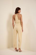 Calça de tecido plano em algodão com padronagem de listras, modelagem cenoura com prega na barra, bolso lateral e posterior, passadores com detalhe de botão forrado e ajuste lateral por fivela de metal fechamento por zíper e colchete. modelo veste tamanho 38.