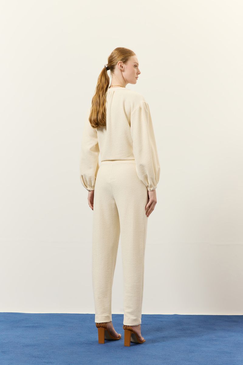 Calça em moletom texturizado com toque rústico, modelagem reta e cós largo com fechamento em zíper de metal lateral. modelo veste tamanho p.