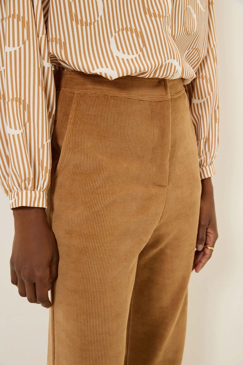 Calça em malha veludo cotelê, modelagem pantalona, cós com fechamento de zíper e colchete, bolso faca e bolso posterior. modelo veste tamanho p.